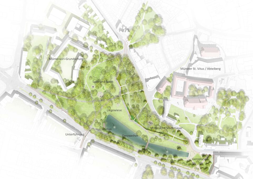Zentrale Idee war es, den Freiraum aufzuwerten, mehr Aufenthaltsqualität zu schaffen sowie Klimaanpassung voranzutreiben und den Park stärker um den erweiterten Geroweiher zu organisieren. Zum vergrößerten Nutzungsangebot zählen neue Sitz- und Liegeflächen am Wasser, ein geplanter Gastronomiepavillon am Geroplatz, barrierefreie Wege sowie dezentral verteilte Spiel- und Sportangebote für alle Generationen. Die Inszenierung des historischen Mauerverlaufs durch eine beleuchtete Mauer, auf der man sitzen kann, verbindet Historisches und Neues.