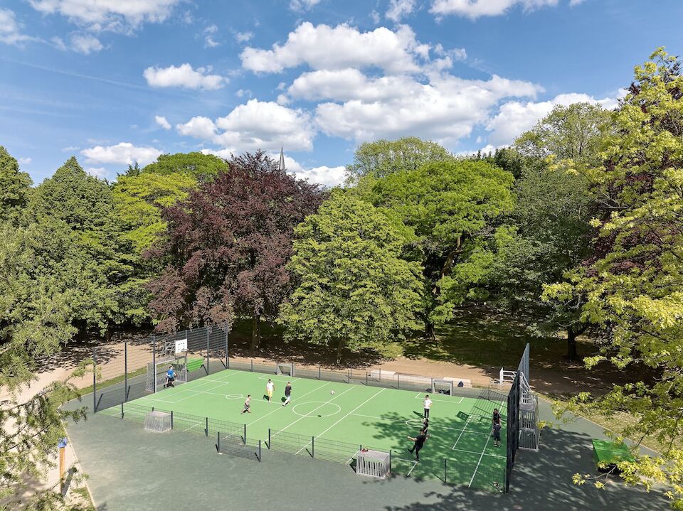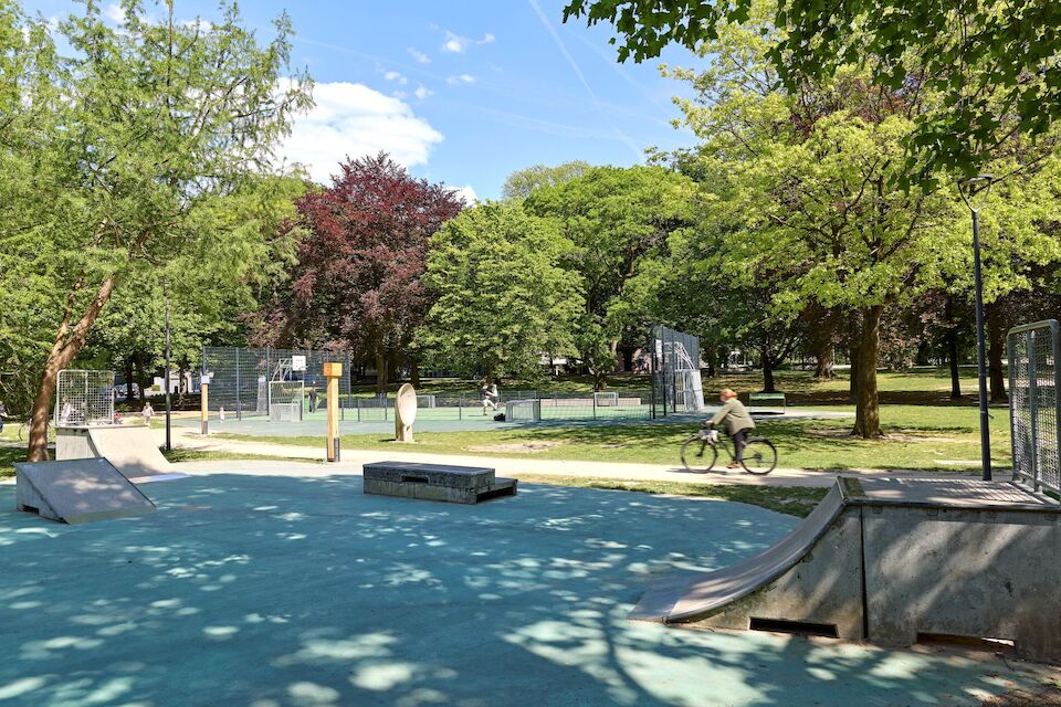 - Es gibt viele barrierefreie Wege sowie neue Sport- und Spielbereiche: unter anderem einen Kleinkinderspielplatz, Multifunktionsflächen (z. B. für Basketball, Fußball), Tischtennisplatten, Skate-Elemente