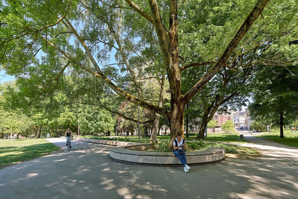 Die ökologische Qualität des Parks wurde durch mehr Grünflächen, die Erhaltung des wertvollen Baumbestands und eine klimabewusste Pflanzenauswahl verbessert. Expert*innen für Baumökologie wurden in der Planung herangezogen, um die Bäume bestmöglich zu schützen. Zur Verbesserung des Mikroklimas in der Innenstadt tragen die erweiterten Wasserflächen maßgeblich bei. Die Reduzierung von versiegelten Flächen (Rückbau der Parkplatzfläche) sowie die Integration wasserdurchlässiger Beläge unterstützen die Versickerung des Regenwassers, was außerdem die Hitzeinseln im Stadtgebiet mildert.