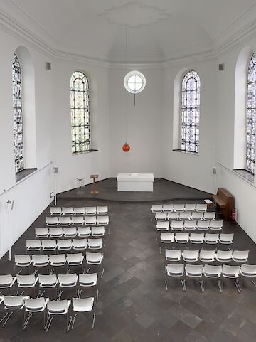Blick vom bereits abgetragenen Altar in den Kirchenraum. Ausstellungseröffnung „Kirchen als Vierte Orte – Perspektiven des Wandels“, 1.9.2024, Heilig-Geist-Kirche, Essen.